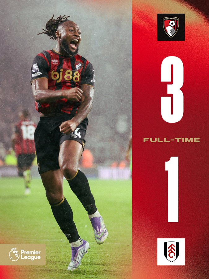 虎扑10月04日讯北京时间10月4日,英超第7轮继续进行,伯恩茅斯在主场迎战富勒姆。尽管先丢一球,但凭借塞门约的出色表现,伯恩茅斯下半场连进三球,最终以3比1逆转取胜。
